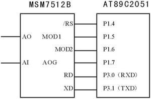相比較CMX469A而言,由于MSM7512B為固定傳輸速率的MODEM芯片,其與單片機的接口更簡單。MSM7512B與單片機AT89C2051的接口電路如圖2所示。
