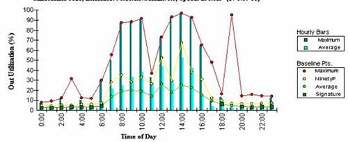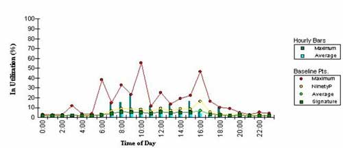 利用率問題包含兩方面。第一,要確定工作站什么時候確實處于使用之中幾乎是不可能的。即使有一個人坐在辦公桌前,他也許在打電話,并沒有使用網絡。第二,許多用戶在本地工作,他們在完成工作之后把他們的工作存儲在網絡上。因此,在使用中, 你必須知道這個網絡什么時候在真正地使用以確定正在消耗的帶寬有多少。例如,參考下面的兩個圖表: