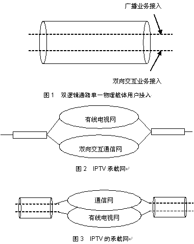 從上面的分析可以看出,由于業(yè)務(wù)從本質(zhì)上來(lái)講可以分為兩大類(lèi),一類(lèi)是廣播業(yè)務(wù),另一類(lèi)是交互型業(yè)務(wù);因而支撐這兩類(lèi)業(yè)務(wù)的承載網(wǎng)也應(yīng)該是兩類(lèi),一類(lèi)是單向的廣播網(wǎng),另一類(lèi)是雙向交互網(wǎng)。由于這是兩類(lèi)性質(zhì)完全不同的承載網(wǎng),從這個(gè)意義上說(shuō),網(wǎng)絡(luò)(有線電視網(wǎng)和電信網(wǎng))是很難融合的,主干網(wǎng)根本不可能,惟一可能的是“最后一公里”的用戶接入線,從眾多的用戶接入線技術(shù)中,目前看來(lái)只有兩種技術(shù)可用,一種是光纖用戶接入線,采用單纖雙波技術(shù),即采用波分復(fù)用技術(shù),用兩個(gè)波分別用來(lái)承載兩種接入業(yè)務(wù);另一種技術(shù)是HFC(經(jīng)過(guò)雙向改造和數(shù)字化后)技術(shù),這種技術(shù)本質(zhì)上是采用頻分復(fù)用技術(shù),一部分頻段用于雙向交互業(yè)務(wù)的接入,另一部分頻段用于廣播業(yè)務(wù)的接入。再仔細(xì)分析一下,發(fā)現(xiàn)這兩種用戶接入技術(shù)有一個(gè)共同的特點(diǎn),即從邏輯上看,它是兩種完全獨(dú)立的、互不影響的技術(shù),用一個(gè)物理載體來(lái)承載。其示意如圖1所示。