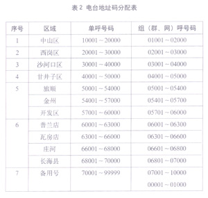 對900 MHz無中心系統的管理,主要是對電臺呼號編碼的管理,包括電臺地址碼的編制分配以及對具體電臺呼號的指配。根據信無函[2005]53號文的規定,各地無線電管理機構可根據本地實際情況自行分配電臺地址碼,指配電臺呼號。為了便于對電臺呼號的識別和管理,在實際工作中,我們按照本地行政區劃的特點,對電臺地址碼進行了細分。下面以遼寧省大連市為例,介紹電臺地址碼的具體分配方案(見表2)。