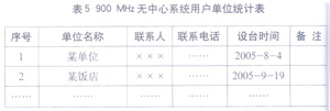 對900 MHz無中心系統的用戶電臺呼號進行管理,主要是對單呼號、組(群、網)呼號以及用戶單位信息的管理,這些工作可通過運用以下三張表格來完成:900 MHz無中心系統單呼號碼表,組(群、網)呼號碼表,用戶單位統計表(見表3、表4、表5)。例如,大連某飯店申請30個單呼號碼、1個組呼號碼,我們為其指配的單呼號碼范圍為10101~10130,組呼號碼為01001,并為組呼號碼設定專用信道Ch5。