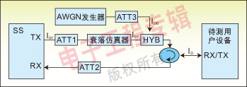 在3GPP的測試規范(TS 34.121)中規定了衰落測試的連接方法(如圖3),即由測試設備發出的下行信號首先經過衰落模擬器,再在經過衰落的信號中加入AWGN噪聲。此時到達UE端的信號即為經過衰落并且受AWGN干擾的信號,用它來測試UE在衰落情況下的接收性能。