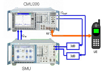 而現在的衰落仿真則通常直接在基帶中實現。在此,我們選擇R&S公司(羅德與施瓦茨公司)的無線綜合測試儀CMU200用于產生WCDMA的下行信號;使用矢量信號發生器SMU200進行衰落以及AWGN仿真。首先由CMU200產生下行信號,直接在基帶引出其I/Q信號,經SMU200進行衰落仿真后,再把相應的信號引回到CMU200,然后經其射頻端口輸出,如圖5所示。