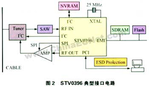 首先選擇符合Docsis1.1/Euro-docsis1.1規范的Cable Modem前端單芯片接口芯片 STV0396作為Cable Modem解決方案,這一部分既可以作為一個獨立的PCI卡來設計,也可以將其直接嵌入母板上,STV0396是一個高度集成的調制解調系統,包括支持上行和下行符合DOCSIS1.1規范的物理層規范接口,媒體接入控制(MAC)以及功能強大的32位ST20 RISC處理器、PCI、EMI/MPX等與ST40GX1相兼容的外部接口。STV0396采用316管腳的GBA封裝,除需外接雙向調諧器外,還需要添加下行方向的聲表面波濾波器(SAW、上行方向的線路放大器以及時鐘等,才能實現與線纜頭端設備CMTS之間的通信連接,其典型接口電路如圖2所示。