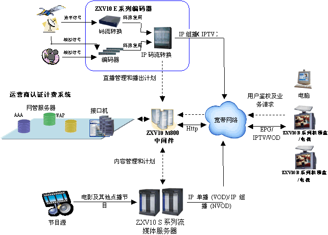 系統工作過程大致如下:①媒體源經過媒體處理模塊處理成系統所定義的格式,存儲在主媒體基站上,并由后臺的媒體分發管理模塊負責如何將這些節目分發到下面的每一個區域中的媒體基站中。②同時有關節目的信息也被下發到EPG服務器中,供EPG顯示給用戶。③用戶開機經過后臺認證后登錄到EPG服務器上,開始瀏覽系統的節目信息。④當用戶選擇一個節目觀看后,EPG將有關節目信息和用戶的信息發送到后臺部分,由后臺的用戶管理部分判斷用戶是否能夠欣賞節目,如果可以,用戶的機頂盒則向本區域的媒體基站發送播放節目的請求。⑤播放完畢,機頂盒向后臺發送扣除相應收費的請求,同時重新定向到EPG服務器,用戶可以繼續瀏覽節目和欣賞節目。