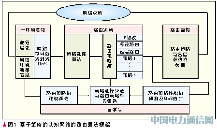 針對復雜的網絡環境,如何適應環境,充分利用鏈路資源、網絡資源、用戶資源,獲得端到端的優化目標是路由算法需要解決的問題。依據認知網絡的定義,我們給出了基于策略的認知網絡的路由算法框架,如圖1所示。該框架包括如下幾個功能模塊。