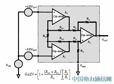 圖1:三運放儀表放大器,其VCM為共模電壓,而VDIFF為相同儀表放大器的差動輸入。