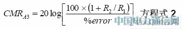 具體而言,將R1:R2同R3:R4匹配至關重要。結合A3,這4個電阻從A1和A2的輸出減去并增益信號。電阻比之間的錯配會在A3輸出端形成誤差。方程式2在這些電阻關系方面會形成CMR誤差: