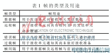 CAN系統(tǒng)中節(jié)點(diǎn)之間以報(bào)文的形式進(jìn)行通信,其報(bào)文有五種類(lèi)型:數(shù)據(jù)幀、遠(yuǎn)程幀、錯(cuò)誤幀、過(guò)載幀和幀空間[2]。每種幀都有相應(yīng)固定的格式,其中數(shù)據(jù)幀和遠(yuǎn)程幀與應(yīng)用密切相關(guān),其他類(lèi)型幀由CAN控制器根據(jù)具體的情況自動(dòng)傳輸。幀種類(lèi)及用途如表1所示。