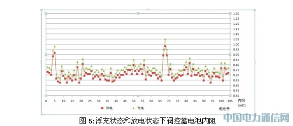 蓄電池處于不同的狀態,其內阻值也是有差異的。圖5是把1#蓄電池組作為測試對象,數值較高的數據是在浮充狀態下測得的,停止浮充、轉入放電后電池內阻變小。變化幅度均勻,平均為6.5%,可以解釋為浮充狀態下極化內阻的影響。