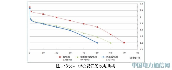 蓄電池的不同失效模式反映在內阻變化的幅值并不一樣。為此找了2只原先使用的不同劣化程度的電池和1只新電池做了對比試驗,圖7是不同劣化模式下的電池放電曲線。通過對比試驗可以發現不同劣化程度蓄電池內阻的變化幅度。從輸出容量的大小排列,依次為新電池、極板腐蝕后電池、失水后電池。