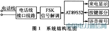 本系統采用Atmel公司的增強型單片機AT89S52作為控制芯片。如圖1所示,系統由4個部分組成:FSK信號解調部分、來電信息顯示部分、按鍵部分和語音播放部分。系統結構如圖1所示。