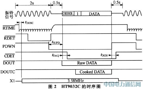 觸發下降沿。在DOUTC腳只輸出主叫識別信號;而在DOUT腳輸出包括信道占用信號(由一組300個連續的O和1交替組成,第1位為0,最后1位為1,在通話狀態下信道占用信號不發送),標志信號(由180個<掛機狀態下>或80個<通話狀態下>標志位<邏輯1>組成,即持續的高電平),以及主叫識別信號的所有信號。各腳的時序波形如圖2所示。在VSS=0V,VDD=5V,晶振為3.58MHz,工作溫度Ta=0-70℃時,測得tDOSC=2ms,tSUPD≥15ms,tDAQ=14ms,tDCH≥8ms。