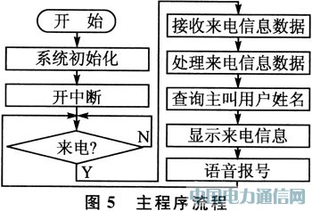系統的軟件主要實現HT9032C FSK解調信號的采集、數據處理、來電用戶姓名查詢、來電信息數據顯示、語音報號功能。主程序流程如圖5所示。