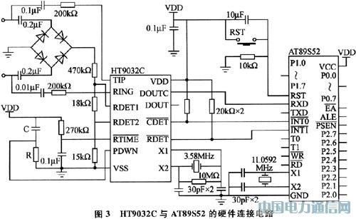腳觸發外部中斷0。HT9032C的DOUTC引腳接AT89S52的串行接地引腳。當檢測到振鈴和有效載波信號時,便打開串口中斷,接收解調的FSK信號,得到來電信息。
