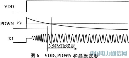 設計中,為了確保FSK解碼芯片正常工作,需要PDWN引腳在VDD上電和晶振振蕩穩定后,才能拉低,否則會導致復位不良。如果PDWN外接RC電路,可適當加大C值,以延長PDWN下降的時間。圖6為C=0.1μF,R=81kΩ時,VDD、PDWN和晶振X1的波形。其中,VT為輸入低限門檻電壓。