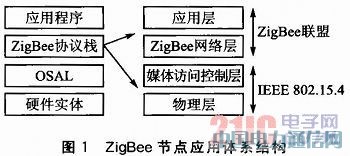 本平臺(tái)采用ZigBee標(biāo)準(zhǔn)技術(shù),其具體應(yīng)用體系結(jié)構(gòu)如圖1所示。其中,硬件實(shí)體層主要由處理器模塊、無(wú)線通信模塊構(gòu)成,區(qū)別于協(xié)調(diào)器或路由器的全功能設(shè)備,作為精簡(jiǎn)功能設(shè)備的終端節(jié)點(diǎn)一般還需再配上傳感器硬件模塊以實(shí)現(xiàn)數(shù)據(jù)采集;OSAL軟件功能模塊作為TIZ-Stack協(xié)議棧中的操作系統(tǒng)抽象層,統(tǒng)一管理協(xié)議棧的運(yùn)行以及各種任務(wù)事件的響應(yīng);ZigBee協(xié)議棧運(yùn)行于OSAL抽象系統(tǒng)之上,該協(xié)議棧是由層來(lái)量化表示其整個(gè)協(xié)議標(biāo)準(zhǔn)的,每一層負(fù)責(zé)完成所規(guī)定的任務(wù),并且向上層提供相應(yīng)的數(shù)據(jù)接口及服務(wù);ZigBee技術(shù)體系結(jié)構(gòu)主要由物理(PHY)層、媒體訪問(wèn)控制(MAC)層、ZigBee網(wǎng)絡(luò)(NWK)層以及應(yīng)用(APL)層構(gòu)成,其中物理層與媒體訪問(wèn)控制層協(xié)議為IEEE 802.15.4協(xié)議標(biāo)準(zhǔn),網(wǎng)絡(luò)層由ZigBee技術(shù)聯(lián)盟制定,而應(yīng)用層的應(yīng)用則根據(jù)用戶自己的應(yīng)用需求進(jìn)行開發(fā)利用。