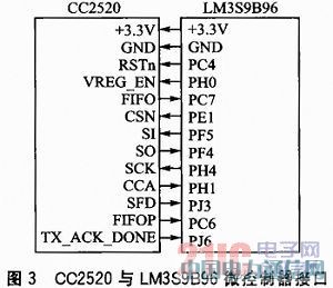 LM3S9B96微控制器提供了3個(gè)UART通信口,在zstack_collector工程中選擇UART0作為串行通信端口。在系統(tǒng)時(shí)鐘配置上,為使協(xié)調(diào)器節(jié)點(diǎn)運(yùn)行在50 MHz的頻率上,需使用PLL(Phase Locked Loop,鎖相環(huán))進(jìn)行系統(tǒng)時(shí)鐘4分頻配置。另外,程序中使用定時(shí)器timer0A與time0B以支持協(xié)議棧任務(wù)的運(yùn)行。CC2520與LM3S9B96之間采用SPI接口,其他引腳配置為:FIFOP作為接收數(shù)據(jù)包判斷的重要引腳,對(duì)應(yīng)開發(fā)板上的中斷引腳PC6;數(shù)據(jù)緩存判斷引腳FIFO則對(duì)應(yīng)PC7。在接收模式下,當(dāng)發(fā)生越界或幀接收完畢時(shí),F(xiàn)IFOP引腳可以用來(lái)中斷微處理器,F(xiàn)IFO引腳可以用來(lái)判斷數(shù)據(jù)是否都處于接收FIFO中。CC2520與LM3S9B96微控制器的接口如圖3所示。