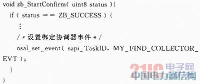 設(shè)備啟動(dòng)完畢后,作為路由器或終端節(jié)點(diǎn)的設(shè)備將自動(dòng)調(diào)用回調(diào)函數(shù)zb_StartConfirm()確認(rèn)設(shè)備是否啟動(dòng)成功,同時(shí)在函數(shù)內(nèi)部觸發(fā)設(shè)備綁定事件MY_FIND_COL_LECTOR_EVT。其核心代碼如下: