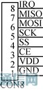 這8個引腳分別和微控制器的GPIO口相連,微控制器在初始化是設置成相應的功能。GND為電源地;VDD為正電源1.9~3.6 V輸出;CE為工作模式的選擇,RX或TX模式;SS為SPI片選使能,低電平使能;SCK為SPI時鐘;MOSI 為SPI輸入;MISO為SPI輸出;IRQ為中斷輸出。