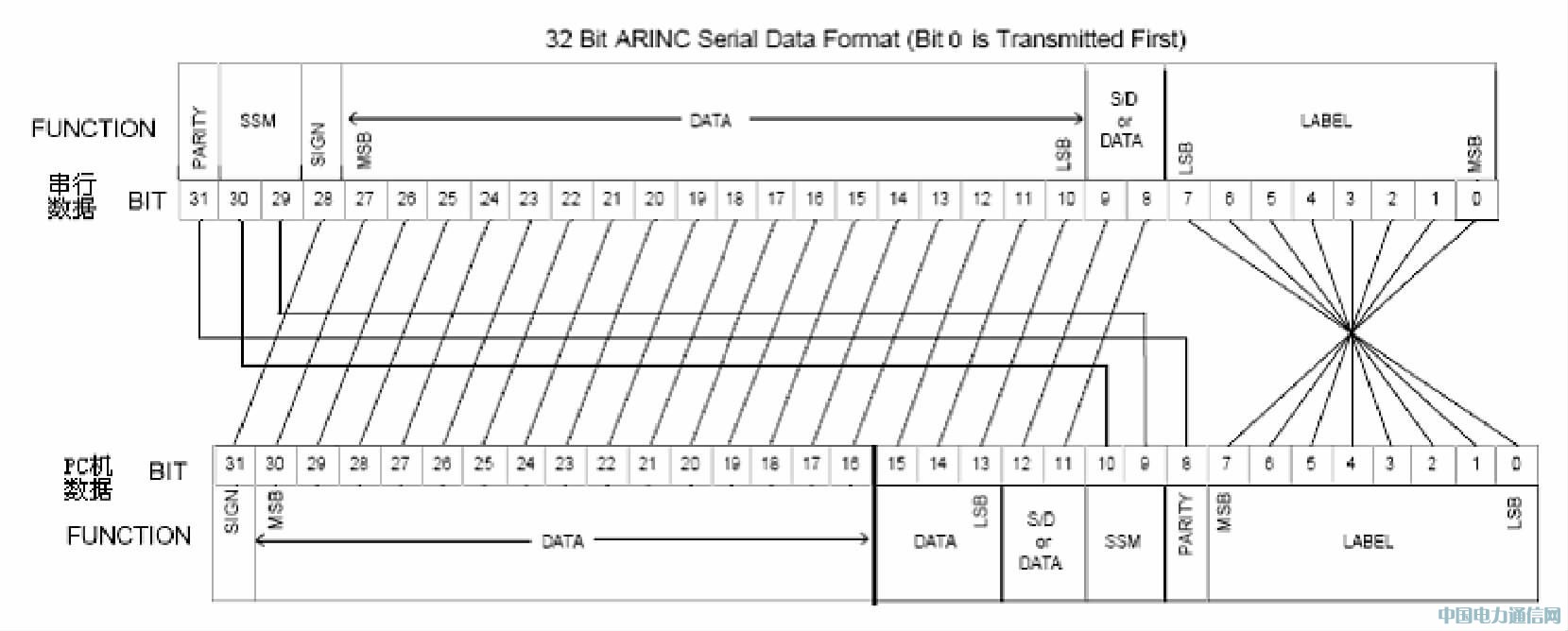 ARINC429是一種廣泛應(yīng)用于民用和軍用飛機(jī)的串行數(shù)據(jù)總線結(jié)構(gòu),是一種單向廣播式數(shù)據(jù)總線,其傳輸介質(zhì)為屏蔽雙絞線,調(diào)制方式采用雙極歸零制的三態(tài)碼方式,具有很強(qiáng)的抗干擾能力。數(shù)據(jù)傳輸采用廣播傳輸原理,按開環(huán)進(jìn)行傳輸,傳輸速率有兩種:高速傳輸率為100kb ps±1%,低速傳輸率為12~14.5 kbps±1%.ARINC429規(guī)范規(guī)定,一個(gè)數(shù)據(jù)字有32位。數(shù)據(jù)字有5種形式:二進(jìn)制補(bǔ)碼(BNR)數(shù)據(jù)、十進(jìn)制(BCD)數(shù)據(jù)、離散數(shù)據(jù)、維護(hù)數(shù)據(jù)、AIM(即應(yīng)答、ISO5號(hào)字母表和用ISO5號(hào)字母表表示的維護(hù)數(shù)據(jù))數(shù)據(jù)。它們被分為5段,如圖1所示。