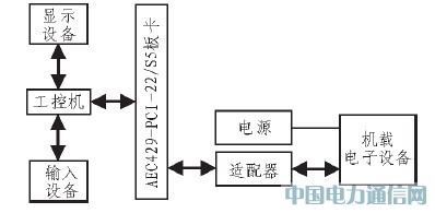 將AEC429-PCI-22/S5接口卡的每個(gè)發(fā)送通道和接收通道分別作為總線數(shù)據(jù)仿真系統(tǒng)的的模擬輸入及輸出端口,也可直接與相應(yīng)的檢測(cè)設(shè)備相連進(jìn)行總線數(shù)據(jù)通訊,按照ARINC429協(xié)議采用屏蔽雙絞電纜,利用特定的適配器,實(shí)現(xiàn)對(duì)機(jī)載電子設(shè)備的指令數(shù)據(jù)的模擬輸入及工作狀態(tài)數(shù)據(jù)和故障信息的查詢。由于不同的機(jī)載電子設(shè)備具有不同的通訊協(xié)議及硬件接口,故配合系統(tǒng)軟件設(shè)計(jì),系統(tǒng)還根據(jù)不同設(shè)備的特點(diǎn),設(shè)計(jì)了特定的適配器,以滿足多型設(shè)備總線數(shù)據(jù)發(fā)送、采集及故障診斷的需要。如圖3所示。