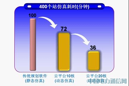 目前我們內部建立的云平臺采用業界先進的分布式集群作業調度的工作模式,可以支持大量并行作業,提供7*24小時自動負載均衡的計算服務,已經具備104臺高性能刀片服務器,總計1216核心的計算能力。現場工作人員通過遠程的方式利用云平臺完成所有的計算,提取前臺所需要的技術進行現場實際部署時所需要的數據。同時,結合基于web的用戶管理和訪問機制為用戶數據的安全性提供了充分保護。經過統計,400個站址的仿真耗時為:傳統規劃軟件需要100min,10核的云平臺需要72min,20核的云平臺則只需36min(如圖5所示)。由此可見,云計算模式的高效性極其可觀。