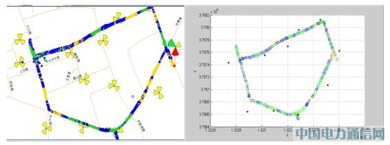 關于仿真建模中的UE分布,LTE云規劃解決方案可以允許實際測試路線的導入,結合實際地形,使得仿真與測試環境更加接近。圖9為實際測試路線及仿真建模的UE分布。