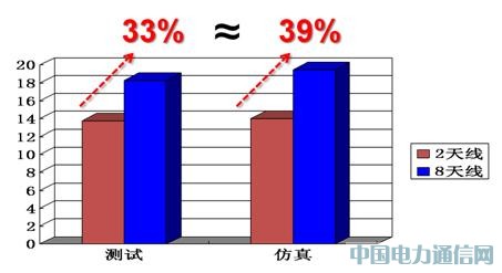 關于2/8天線對比的需求來自《TD-LTE規模技術試驗——六城市測試——2/8天線對比測試規范》。LTE云規劃解決方案可以進行真實高效的動態仿真,并指導測試,滿足規劃和測試方面的各種需求。下圖為LTE動態仿真云平臺的仿真結果,8天線針對兩天線有39%的吞吐量提升,與真實外場測試的吞吐量提升結果比較接近。