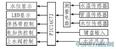 該控制器主要是用于測量、顯示落水式太陽能熱水器水箱中的水位和水溫,上下水管道溫度,控制電磁閥上水、控制輔助電加熱及管道防凍電伴熱帶等。它主要由單片機PIC16C72、水箱溫度和管道溫度傳感器、水位傳感器及測量電路、輸入按健、用水水流開關(guān)、電磁閥控制、電加熱控制和電伴熱帶控制等部分組成。控制器結(jié)構(gòu)框圖如圖1所示。單片機PIC16C72作為控制的核心,通過執(zhí)行程序?qū)崿F(xiàn)對系統(tǒng)各部分的控制。水位測量模塊實現(xiàn)水箱水位的測量,溫度測量模塊實現(xiàn)儲水箱水溫、上下水管道溫度的溫度測量。三路控制輸出通過繼電器分別控制上水電磁閥、電加熱器和防凍電伴熱帶工作。LED部分顯示水箱水位,水箱水溫及顯示相關(guān)參數(shù),按健部分用于選擇工作模式、設(shè)置相關(guān)參數(shù)、手動控制上水或電加熱。水流開關(guān)用于測量用水狀態(tài)。