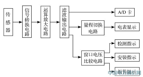 圖1為測頭電路系統(tǒng)結構框圖。測頭電路系統(tǒng)主要由信號轉換電路、運算放大電路、濾波輸出電路、量程切換電路和窗口電壓比較電路五部分組成。傳感器輸出交流電壓信號,電壓值與傳感器磁芯位置成正比,經過信號轉換電路將其轉換為相應的直流電壓信號。運算放大電路對直流電壓信號進行放大,以滿足后續(xù)電路的電壓需求;放大后的直流信號經過濾波輸出電路輸出到A /D 卡,在計算機控制下實現自動檢測;同時,濾波信號經量程切換電路,將直流電壓信號以對應電表不同量程的位移值得以顯示,從而提供直觀的測量結果;濾波信號經窗口電壓比較電路可檢測到測頭位移狀態(tài),分別以檢測、安裝、報警等狀態(tài)顯示輸出,保證了安裝和檢測過程的安全。