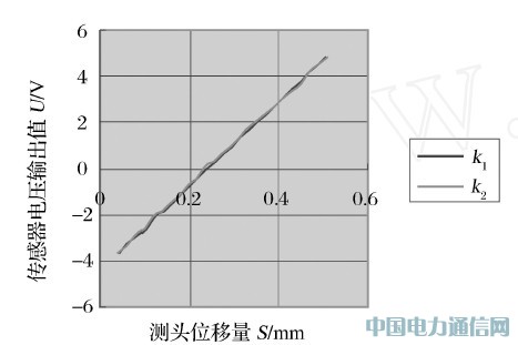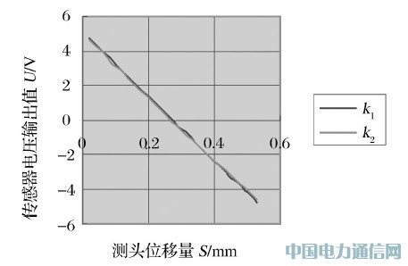 用一等環(huán)規(guī)檢定裝置和數字電壓表對測頭的左、右齒面位移測量進行標定,標定方法采用靜態(tài)特性標定法,標定試驗記錄見圖3、圖4.圖中,k1 , k2 分別表示測頭從零位運動到最大位移量和從最大位移量運動回零位測頭的靈敏度。