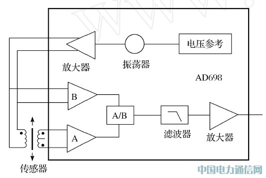 傳感器為線性差分式位移傳感器,它的輸入為磁芯的機械位移,輸出為與磁芯位置成正比的交流電壓信號。傳感器初級線圈由外部參考正弦波信號源激勵,兩個次級線圈反向串聯,磁芯的移動可改變初級線圈之間的耦合磁通,從而產生兩個幅值不同的交流電壓信號。針對傳感器輸出信號特點, 設計了基于AD698芯片的信號轉換電路。 AD698是一種高精度線性差分式位移變壓器(LVDT) 專用信號調整電路,可同時接收兩路差動交流電壓信號。圖2為采用AD698對傳感器進行信號轉換的工作原理圖。AD698用一個正弦波函數振蕩器和功率放大器來驅動傳感器初級線圈,并用兩個同步解調器對初級和次級電壓進行解碼,經過濾波和放大后最終輸出直流電壓信號;AD698經過同步解調可得到次級線圈輸出電壓值和初級線圈輸出的參考電壓值,通過計算A /B的比例并以此設置外部元件參數,可實現零位電壓漂移補償,從而滿足測量的精度要求;AD698的輸入電壓和輸出電壓范圍較廣(均可達到正、負電壓的輸入與輸出) , 可實現測頭從零位到最大位移量及從最大位移量回到零位的測量,擴大了測量范圍。