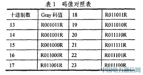 編碼采用格雷碼(Gray)為數值碼,以某一固定碼寬為參考碼R,它用于標尺定位和提高精度。Gray碼是一種絕對編碼方式的無權碼,它所具有的循環、單步特性能消除隨機取數時出現重大誤差的可能,其任意兩個柏鄰整數之間轉換時,只有一個位數發生變化,大大減少了由一個狀態轉到下一個狀態時的邏輯混淆,具有較強的容錯能力。以6位編碼為例,其部分十進制數與Gray碼的一一對應關系如表1所示。
