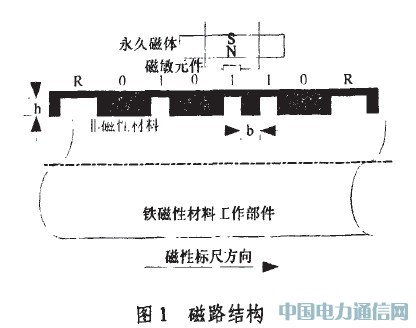 根據磁敏傳感原理,“凹槽”和“凸槽"會導致不同的磁場強度,從而使磁敏元件相應地輸出不同的電半信號“0”或“1”,形成數值碼,用于確定位移的粗讀值;而標志位R碼寬兩倍于碼元“1”寬度的特點,使得識別后的序列出現具有固定特征的標識碼,它用于精讀數。