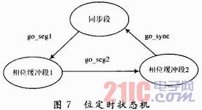 位定時設(shè)計 在位定時設(shè)計中采用了一個有3個狀態(tài)的狀態(tài)機。3個狀態(tài)分別對應(yīng)的是同步段和相位緩沖段1以及相位緩沖段2。傳播段占用的時間短,在控制上沒有特別的意義,僅作為物理層的傳播延時,所以沒有設(shè)計進狀態(tài)機,位定時部分的狀態(tài)機設(shè)計如圖7所示。