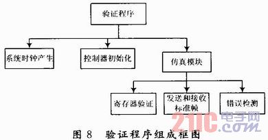 本文最后設(shè)計了CAN總線控制器的測試程序,其目的是模擬一塊微處理器對CAN總線控制器進行讀寫操作,從而實現(xiàn)對CAN總線控制器的寄存器訪問,完成總線收發(fā)功能。在該測試程序編寫中,各個功能基本上以任務(wù)的形式實現(xiàn),進行不同的仿真時只需調(diào)用相關(guān)的任務(wù)模塊。圖8為驗證程序的組成框圖。