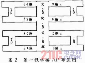 第一教學樓共5層,每層的平面結構如圖2所示。A~H座每部分安裝1個AP,兩個座之間的連接部分安裝1個AP,由于2層的文化長廊比較空曠,沒有遮擋,所以只需要安裝3個AP,所以2層共需要安裝15個AP,其他樓層每層需要安裝12個AP,共需63個AP
