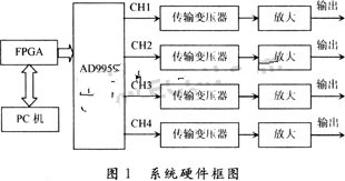 用戶通過計算機將所產生信號的參數傳送給FPGA,FPGA接收到相應的參數后,控制AD9959輸出相應的雷達信號,由于AD9959輸出信號是差分電流信號,因此在系統設計時,采用1:1傳輸變壓器將差分的電流信號轉化為單端的電壓信號,同時為了提高系統的輸出驅動能力,在變壓器后面進行了信號放大,系統框圖如圖1所示。