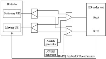 首先,以LTE Release 8的網絡設備射頻測試為例,主要根據規范3GPP 36.141的第七章和第八章進行測試。其中,第七章是基站接收測試,需要信號源能夠產生有用LTE信號、白噪聲信號、干擾信號,信號源SMU200A能夠在一臺源內部同時實現所需的所有三種信號。第八章屬于基站性能測試部分,主要考察了基站在典型衰落場景下的工作性能和混合自動重傳等功能。以3GPP 36.141 8.2.2“上行時延調整”測試例為例,該測試例的背景是將兩個模擬終端信號輸入基站,這兩個終端一個是固定終端,另一個是移動終端,移動終端與基站之間的延時是不停變化的,基站為了能夠正確的接收移動終端發射的數據包,需要將“混合自動重傳(HARQ)”信息發送給移動終端,移動終端根據基站的反饋信號做發射時間的自動調整,同時兩個終端的信號上都加載有加性高斯白噪聲信號,此時觀測基站吞吐率的變化是否滿足規范要求。3GPP給出的測試框圖如圖1所示。
