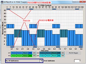再例如LTE-A的上行方向, 要求能夠實現PUSCH分簇,并且支持PUSCH/PUCCH同時發送,圖5是R&S的信號源SMU200A產生LTE-A信號時,同時生成的資源分布圖,通過該圖能夠看到,SMU200A能夠輕松實現這些特性。
