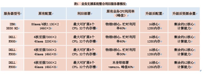 以某地市運(yùn)營商IT系統(tǒng)為例。IT支撐系統(tǒng)虛擬化整合基于初期搭建平臺(tái)預(yù)算及保障業(yè)務(wù)正常運(yùn)轉(zhuǎn)需求的考慮,從該地市50個(gè)系統(tǒng)中選出33個(gè)系統(tǒng),共計(jì)34臺(tái)服務(wù)器進(jìn)行虛擬化整合。系統(tǒng)整合利用原有支撐系統(tǒng)的4臺(tái)服務(wù)器進(jìn)行升級(jí)、虛擬化后形成資源池。4臺(tái)系統(tǒng)服務(wù)器的利舊、升級(jí)情況如表1所示。
