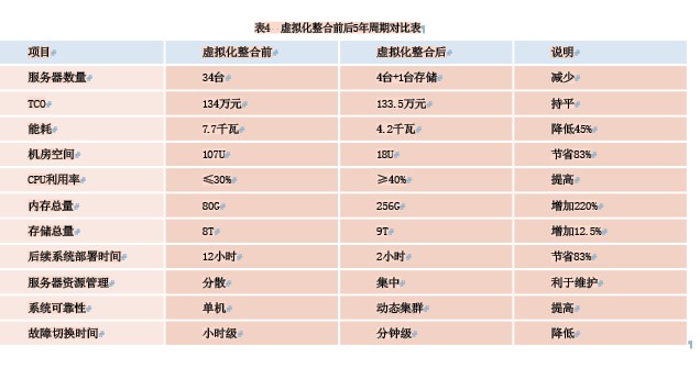 由上面的分析可以看出,虛擬化整合前TCO約為100+34=134萬元;虛擬化整合后TCO約為119+14.5=133.5萬元。整個(gè)項(xiàng)目5年內(nèi)的TCO投資大體持平。此外通過虛擬化整合,將大大減少服務(wù)器的數(shù)量從而獲得大約89U的機(jī)房空間以及大約10臺(tái)可以再次利舊的服務(wù)器(整合后剩余的雙核服務(wù)器)。整個(gè)業(yè)務(wù)支撐系統(tǒng)虛擬化整合項(xiàng)目5年內(nèi)前后對(duì)比如表4所示。