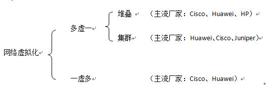 網絡虛擬化可以分為“一虛多” 與“多虛一”兩種。多虛一又可以分為“堆疊”和“集群”兩種。“一虛多”和“多虛一”這兩種虛擬化還可以組合使用,使得網絡部署更加靈活。