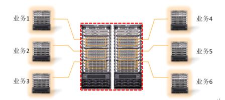 再例如,通常一個園區網絡都會按照三層架構來進行部署,即核心層、匯聚層和接入層。核心交換機負責高速交換,匯聚交換機除負責匯聚各接入交換機外,還負責部署業務,如網關、安全策略、流量監控等。對于在一座樓宇內的部署來說,所有接入交換機都雙歸到中心機房進行匯聚,此時可將核心交換機一虛多虛擬化為若干臺設備,將一部分虛擬設備用作匯聚交換機。這樣,不但匯聚交換機擁有高性能、高可靠的核心交換機硬件資源,還極大方便了業務部署和管理以及網絡資源的整體調配。通常,這被稱為縱向虛擬化。