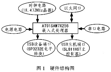 該系統(tǒng)硬件設(shè)計(jì)是由電源、復(fù)位、時(shí)鐘電路、以太網(wǎng)口、USB主機(jī)和設(shè)備端口以及串口組成,其結(jié)構(gòu)框圖如圖1所示。其中,以太網(wǎng)口用于將設(shè)備接入網(wǎng)絡(luò)實(shí)行遠(yuǎn)程管理和監(jiān)控。將設(shè)備的數(shù)據(jù)接入Internet,實(shí)現(xiàn)遠(yuǎn)程監(jiān)控,適用于工礦企業(yè)設(shè)備的集中化管理和維護(hù)。USB主機(jī)端口通過主機(jī)控制器SL811HS/T與控制器AT9lSAM7X256相連,進(jìn)行數(shù)據(jù)通信。USB設(shè)備端口作為與PC機(jī)通信的接口。該系統(tǒng)設(shè)計(jì)的創(chuàng)新在于該設(shè)備拋開了PC機(jī),既可作為主機(jī),也可作為外設(shè),并與其他0TG設(shè)備直接實(shí)現(xiàn)點(diǎn)對(duì)點(diǎn)通信。