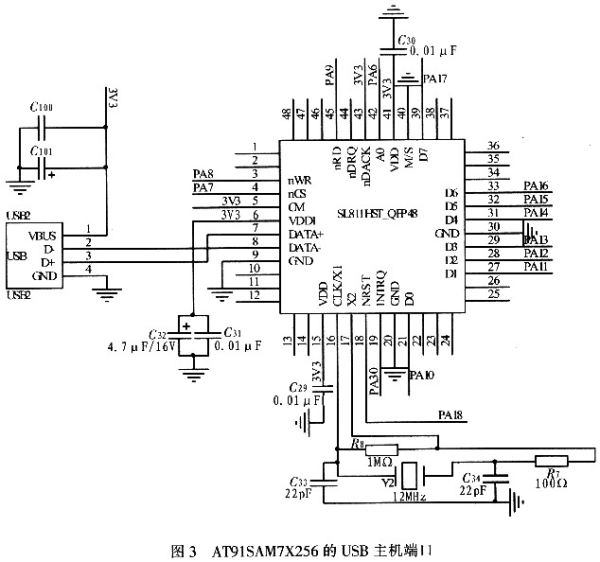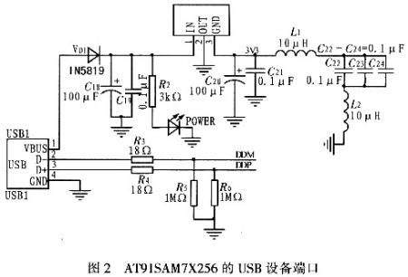 2.2 AT91SAM7X256的USB設(shè)備端口設(shè)計(jì)
