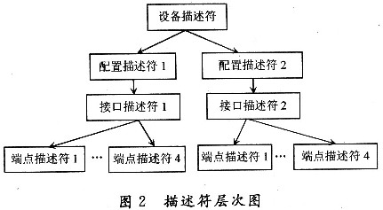 描述符主要是讓上位機了解USB功能設備的基本配置信息和能力,如端點、接口等。在此主要使用標準描述符來說明USB設備,如設備描述符、配置描述符、接口描述符、端點描述符、設備限定描述符等。在該設備中,這些描述符的層次結構如圖2所示。