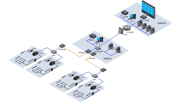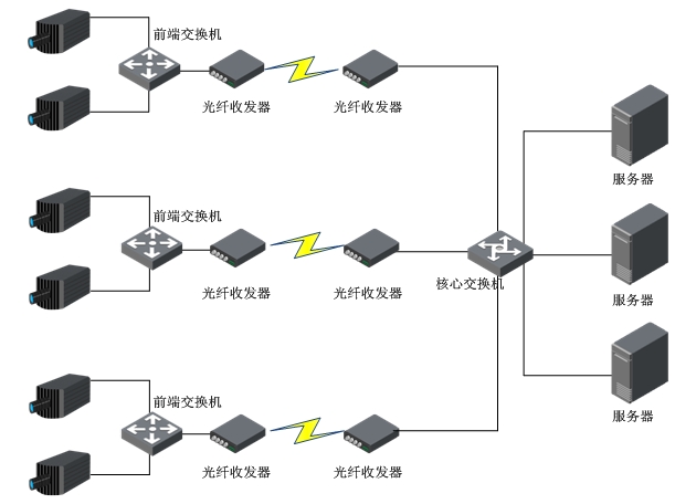 網絡傳輸子系統主要包括交換機、光傳輸設備等,實現前端采集子系統與中心管理子系統之間的數據和圖像信息傳輸。建設光纖鏈路作為前端與中心的數據傳輸通道,保證數據傳輸的實時性和可靠性。本次項目將全部采用光纖傳輸方式。