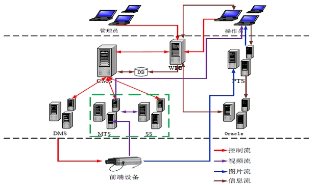 中心管理平臺組成如(圖4)所示,模塊組成包括:1、業務管理服務器(CMS);2、流媒體轉發服務器(MTS);3、流媒體集中存儲服務器(SS);4、設備管理服務器(DMS);數據庫服務器;5、圖片服務器(PTS);6、Web服務器。根據實際的情況,部分服務模塊可以安裝在通一臺服務器中。